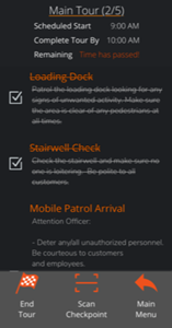 This will open the Main Tour view, layout, and options, including the scheduled start and end times, the time remaining to complete the Guard Tour, and the individual Checkpoints in the order they should be completed.