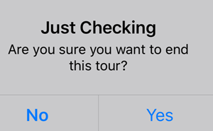 If the End Tour icon is selected before all the Checkpoints are hit, a pop-up box will verify that you want to end the Tour with: "Just Checking - Are you sure you want to end this tour?"