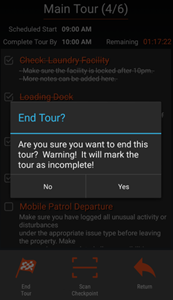 If the End Tour icon is selected before all the Checkpoints are hit, a pop up box will verify that you want to end the Tour with the "Warning! It will mark the tour as incomplete!"